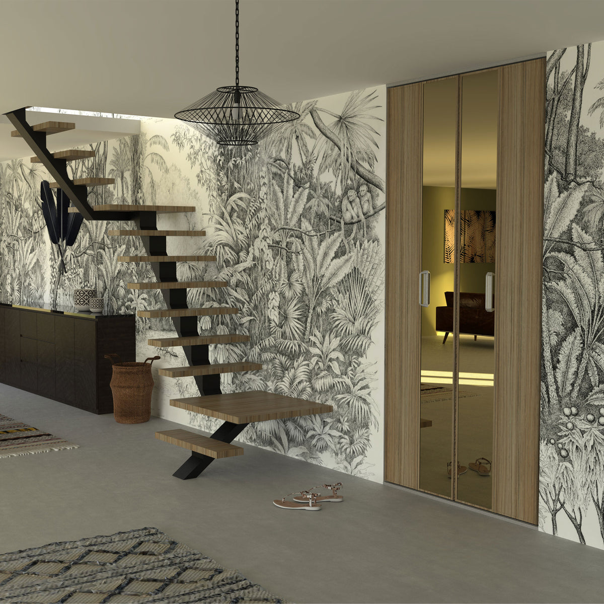 Particulièrement élégants, les miroirs bronze de cette façade de placard pliante sont sublimés par des décors panama et des finitions en alu naturel.