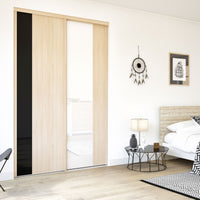 Le style ethnique chic est particulièrement tendance ! Optez pour cette façade de placard et soyez dans le ton : une structure en aluminium haut de gamme et des verres laqués blanc pur et noir pour le chic, un effet acacia clair rappelant le sable du Sahara pour l'ethnique.