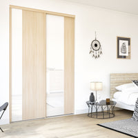 Le style ethnique chic est particulièrement tendance ! Optez pour cette façade de placard et soyez dans le ton : une structure en aluminium haut de gamme et du verre laqué blanc pur pour le chic, un effet acacia clair rappelant le sable du Sahara pour l'ethnique.