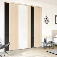 Trois portes de placard coulissantes pour masquer un grand dressing, un effet acacia clair et du verre laqué noir sur une structure en aluminium assortie : vous allez adorer cette composition ! Invitation au voyage et au repos, elle sublime le style ethnique.