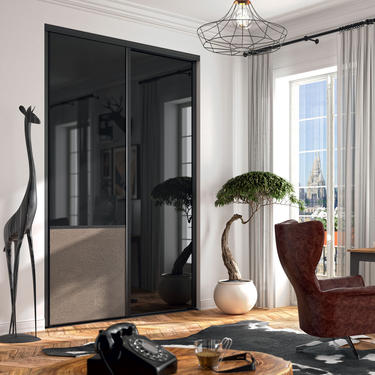 La note de simili cuir vintage beige vient sublimer l'élégance de cette façade de placard et rappelle le style africain. Le verre laqué noir captive les regards. Il est mis en valeur par une structure en aluminium noir mat de grande qualité.