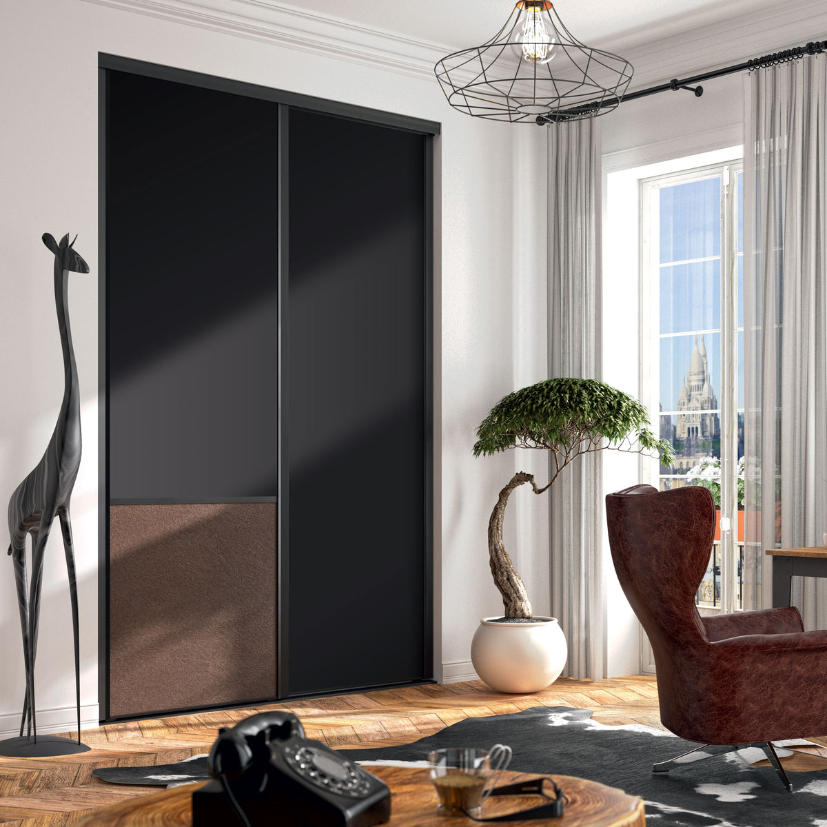 Cette porte coulissante noir mat est parfaite pour un style ethnique chic réussi dans le bureau. Elle surprend par sa touche d'effet cuir vintage brun et rassure grâce à sa structure en aluminium de grande qualité.