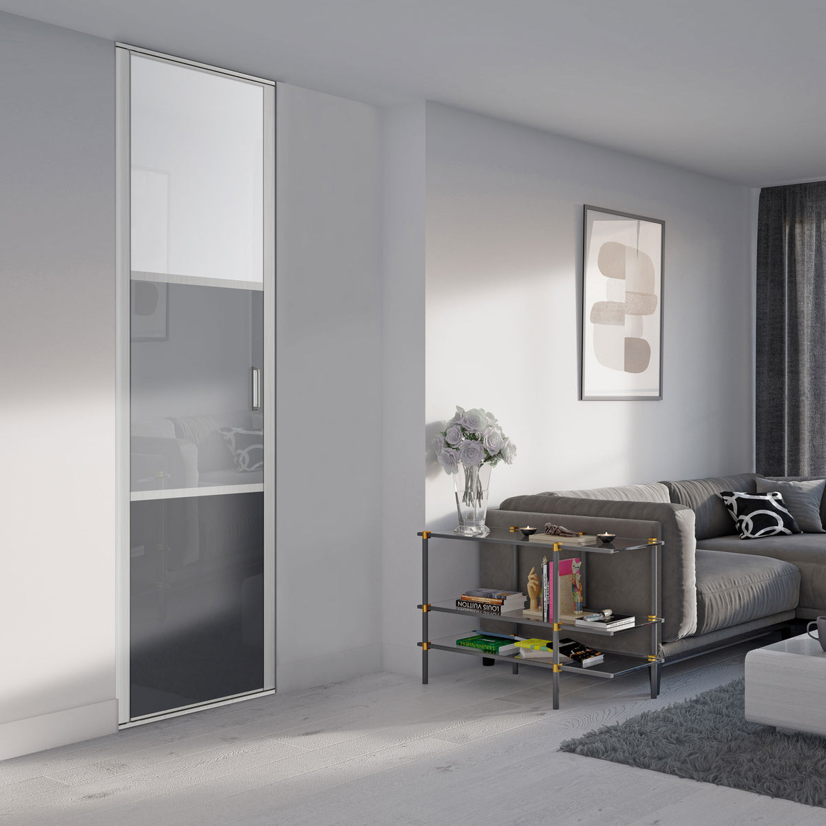 Cette façade de placard pivotante aux trois nuances de verre laqué gris foncé, gris perle et blanc pur est à couper le souffle ! Avec ses finitions en aluminium, elle sera la pièce maîtresse de la décoration de votre salon.