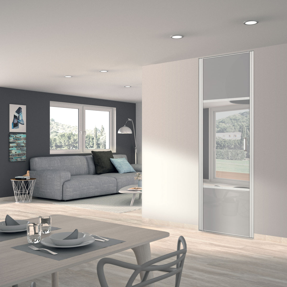 Coup de cœur assuré avec la porte Colibri ! Idéale pour dissimuler un petit placard dans votre salon, l’alliance d’un verre laqué gris perle à un miroir argent illumine la pièce. Le tout est encadré d’une structure en aluminium.