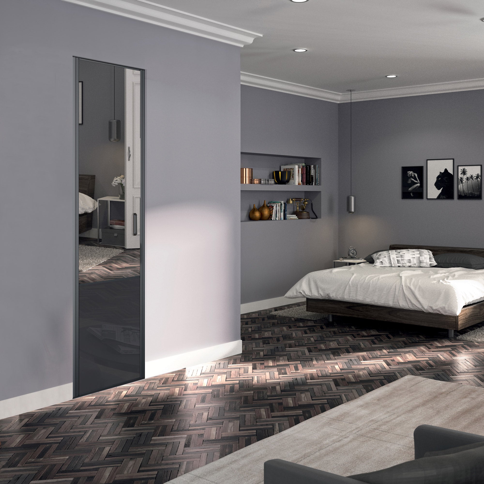 Le grand miroir coloris plomb de cette façade de placard vous permettra de vous observer sous toutes les coutures ! Le verre laqué gris foncé multiplie la luminosité et la profondeur de votre pièce. Les finitions en aluminium noir mat réhaussent avec délicatesse le tout.