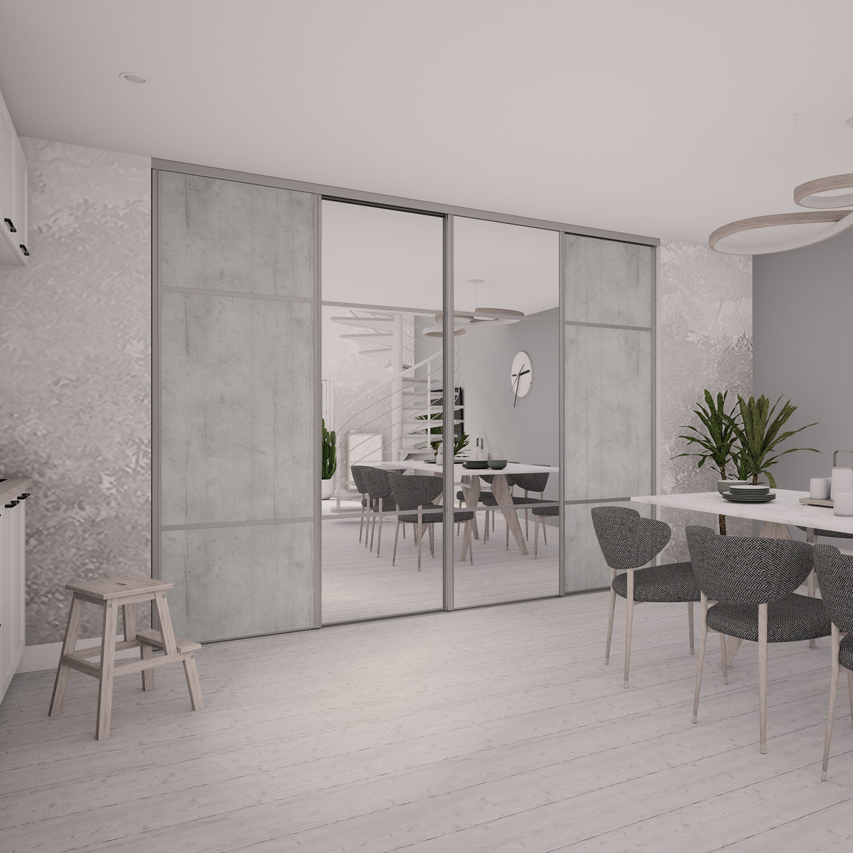 Cette façade de 4 portes de placard Kazed coulissantes est idéale pour les espaces de rangement supérieurs à 4 mètres de large.