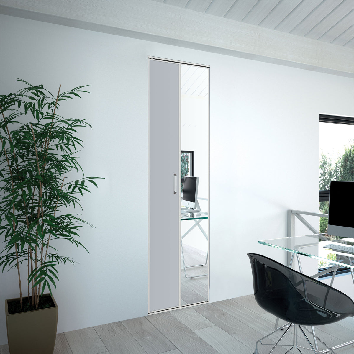 Une ouverture pliante pour le gain de place, un gris intense pour l’élégance, une structure en aluminium pour l’esthétisme, et un miroir argent offrant profondeur et luminosité, cette porte de placard n’offre que des avantages !