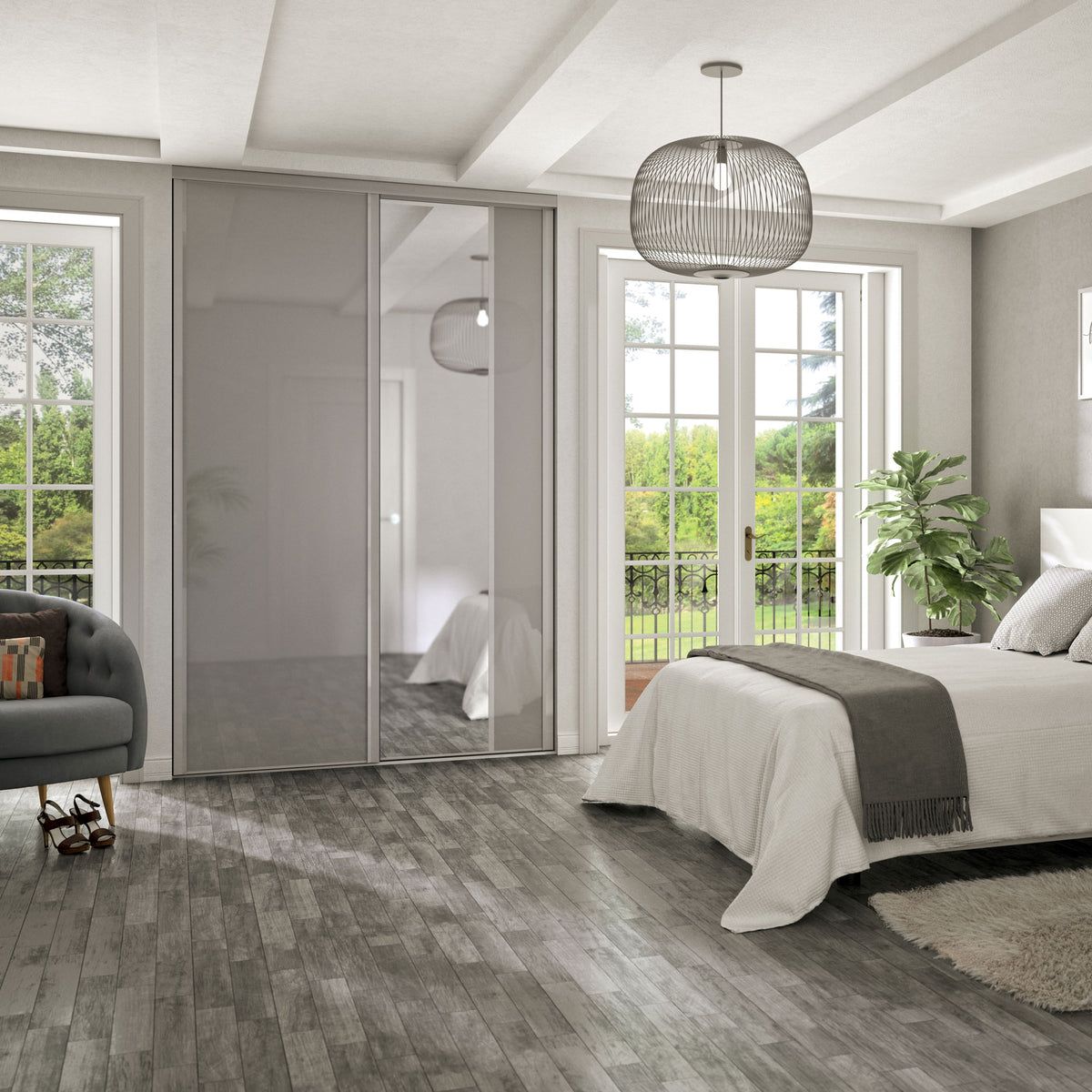 On aime cette Collection toute en brillance ultra lumineuse. L’association du verre laqué Gris perle au miroir Argent et à la finition Alu naturel font de ces portes de placard un objet déco à part entière.
