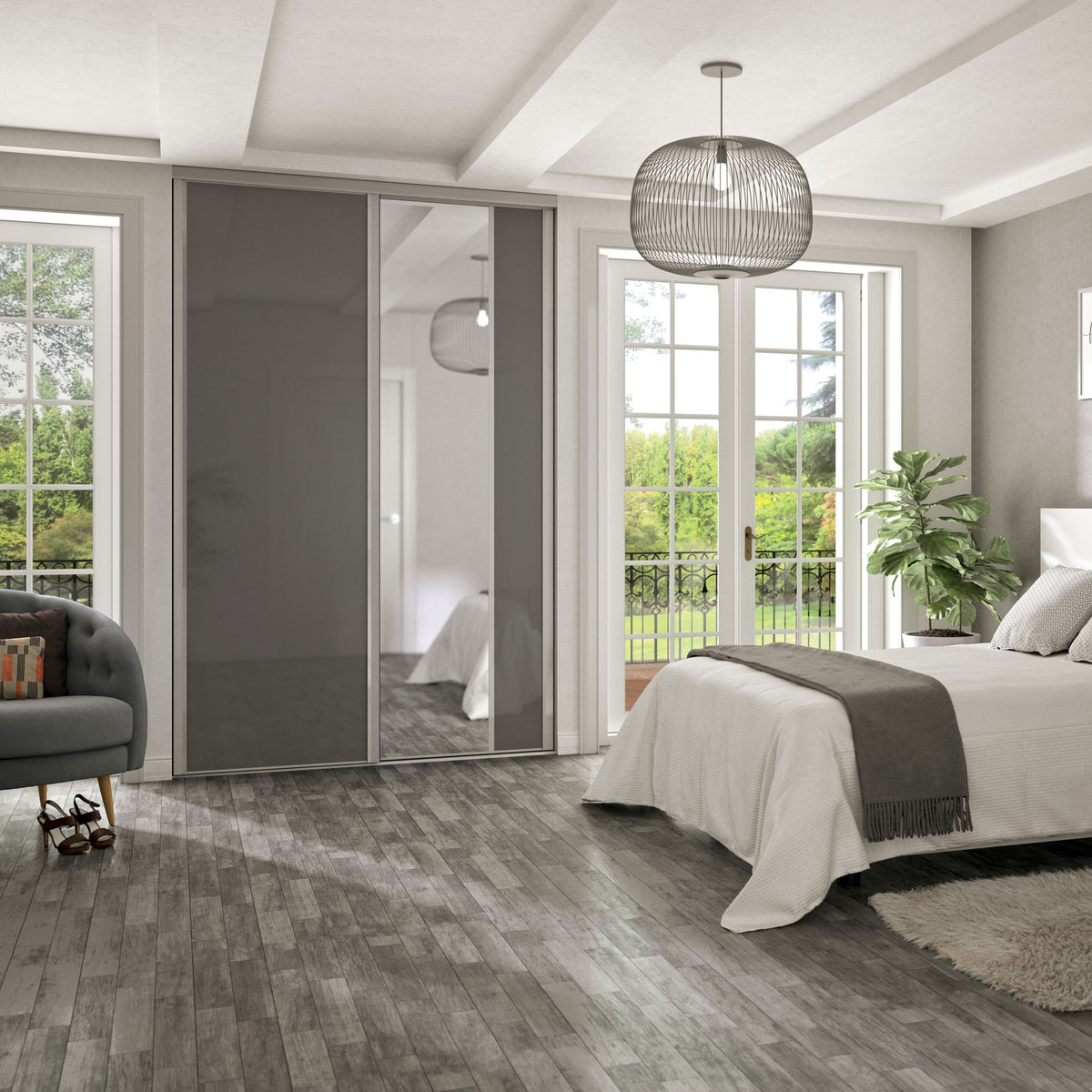 Verticalité et luminosité sont les deux maîtres mots de ces portes de placard coulissantes. Le verre laqué Gris foncé pour le côté chic, le miroir Argent pour le côté pratique, le tout forme une Collection élégante et moderne soulignée par une finition en alu naturel soignée.