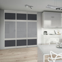 Le verre laqué est idéal dans la cuisine : il joue avec la lumière et possède un fort potentiel décoratif. Cette façade aux nuances de verre laqué gris foncé et gris perle et aux larges traverses en aluminium sera au centre des regards !