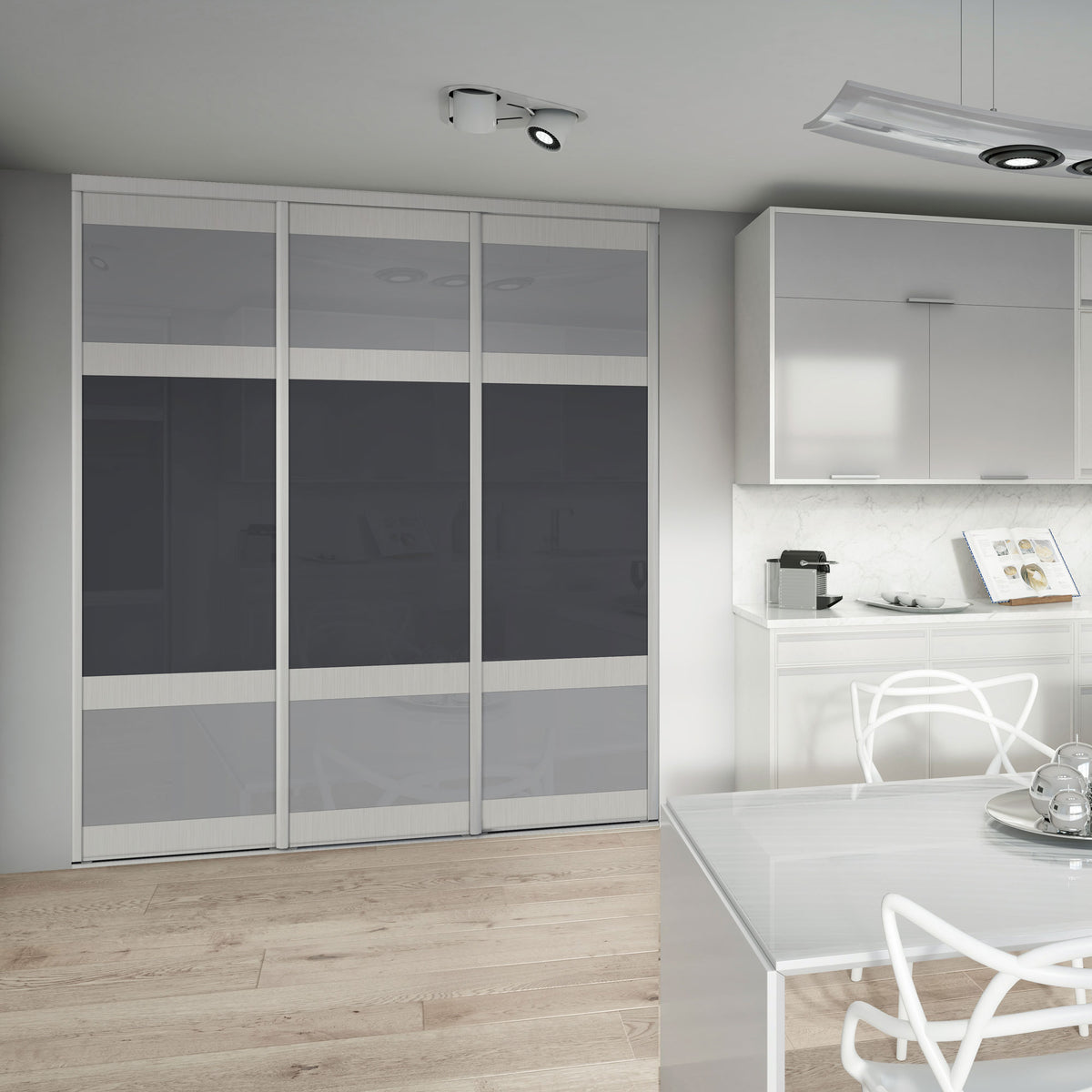 Le verre laqué est idéal dans la cuisine : il joue avec la lumière et possède un fort potentiel décoratif. Cette façade aux nuances de verre laqué gris perle et gris foncé et aux larges traverses en aluminium sera au centre des regards !