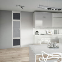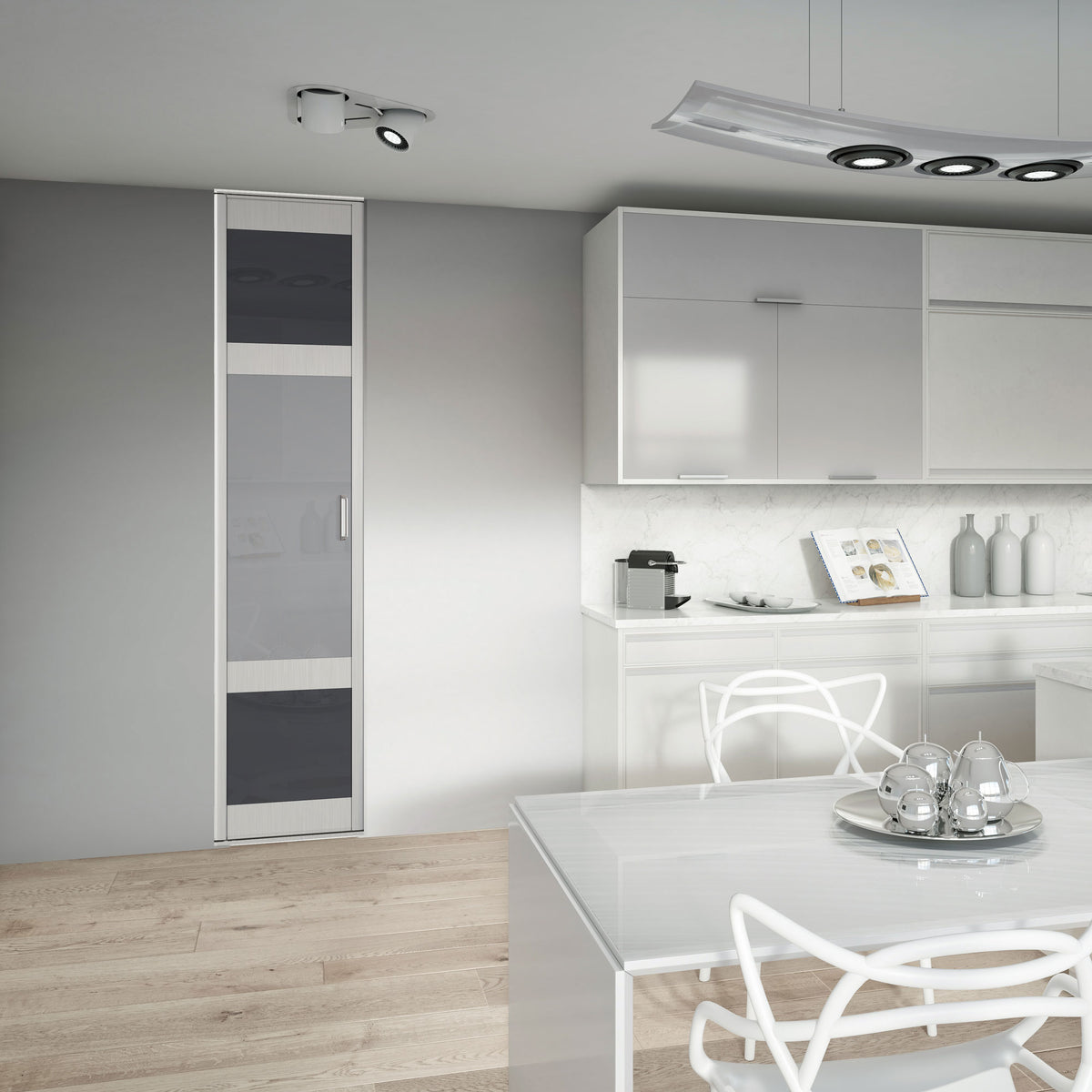 Le verre laqué est idéal dans la cuisine : il joue avec la lumière et possède un fort potentiel décoratif. Cette façade aux nuances de verre laqué gris foncé et gris perle et aux larges traverses en aluminium sera au centre des regards !