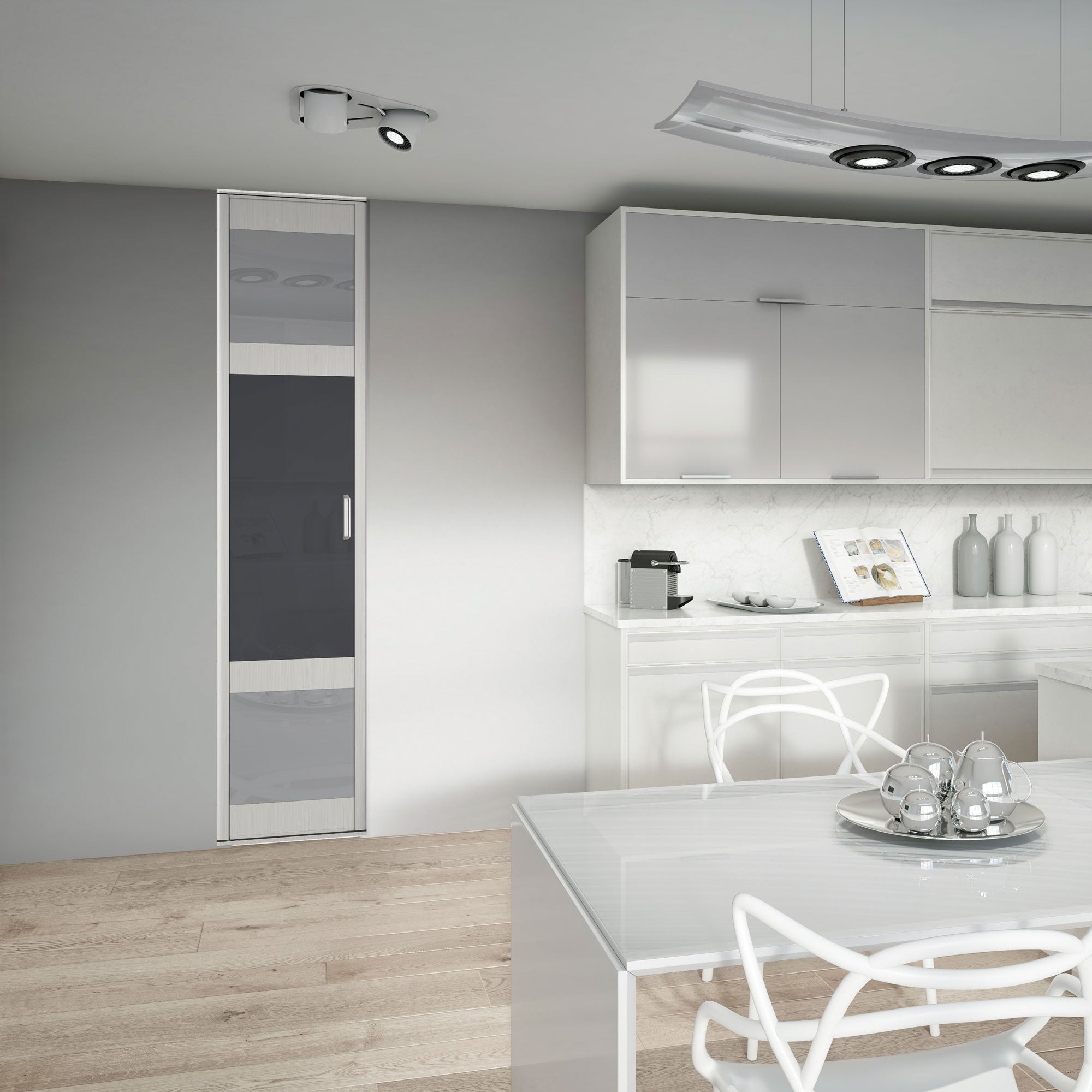 Le verre laqué est idéal dans la cuisine : il joue avec la lumière et possède un fort potentiel décoratif. Cette façade aux nuances de verre laqué gris foncé et gris perle et aux larges traverses en aluminium sera au centre des regards !