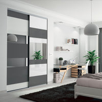 Voilà une composition qui va donner du rythme à votre déco ! Du verre laqué gris, du verre laqué blanc, des miroirs argent, des finitions en aluminium naturel, voici la recette pour une porte de placard design et éclatante !