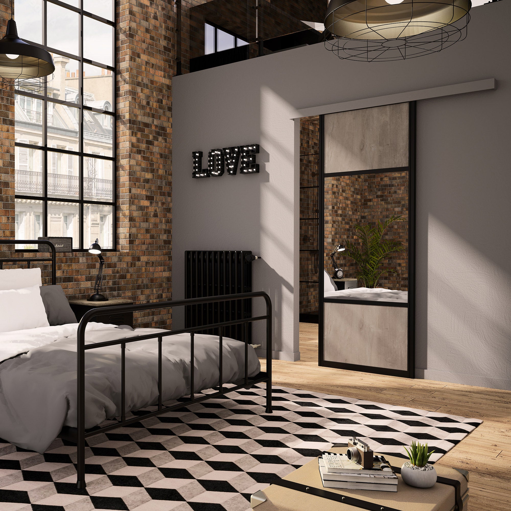 Style Industriel chic pour cette porte en applique coulissante Kazed. Elle mélange la finesse d´un Chêne cigare brut à un miroir central Argent. Ajoutez à cela une structure en aluminium Noir mat et vous obtenez un produit ultra tendance, robuste et fiable.
