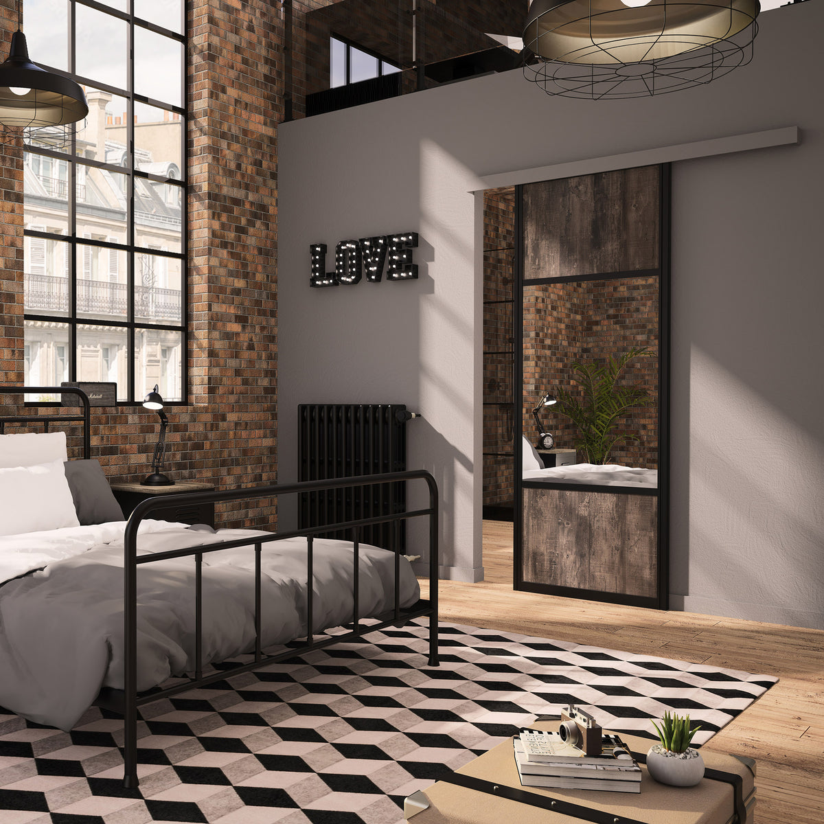 Craquez pour cette porte en applique coulissante Kazed au style Industriel très tendance . Elle mélange un contemporain Bois fumé à un miroir central Argent très lumineux. Avec sa structure en aluminium Noir mat, vous obtenez un produit ultra tendance, robuste et fiable.