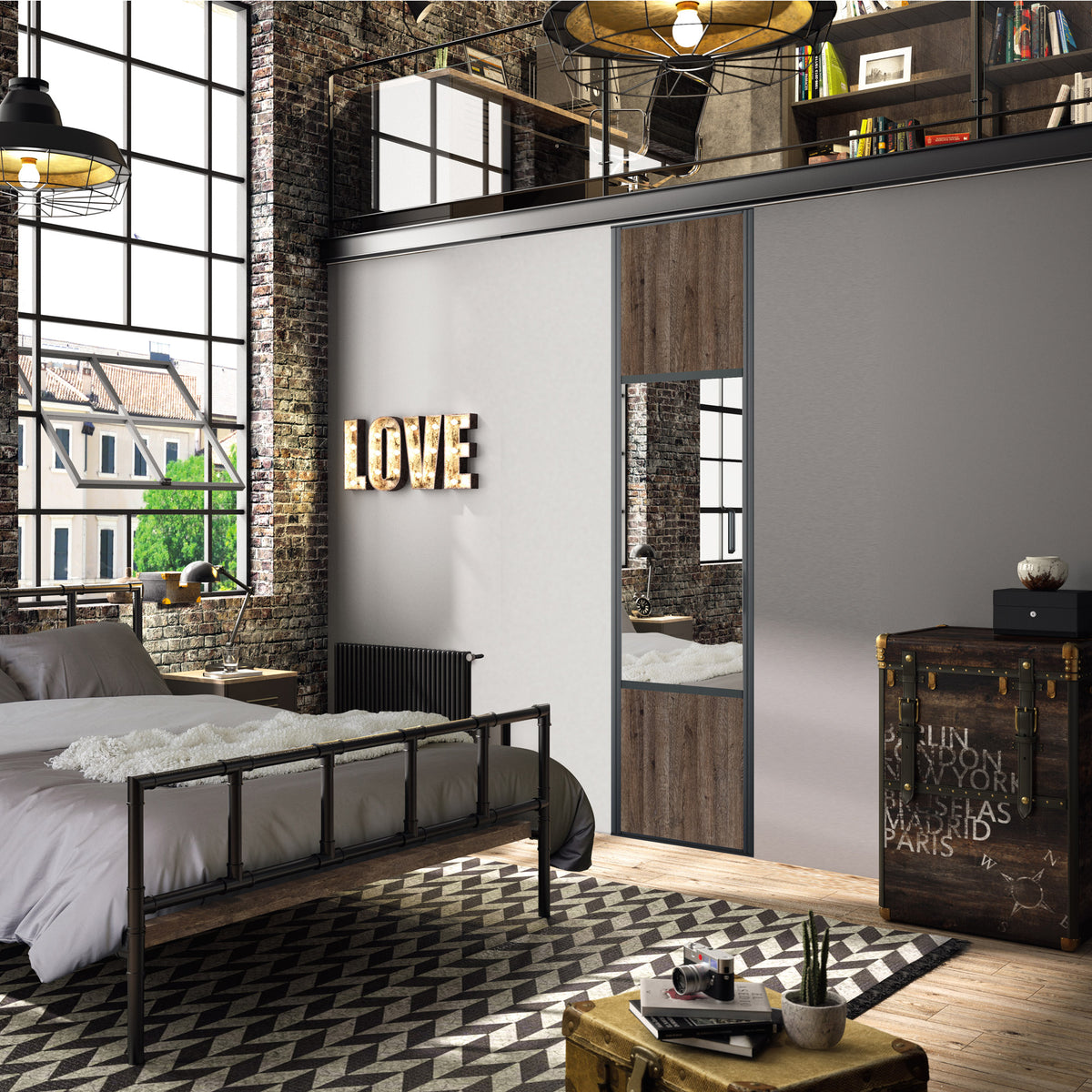 Sur cette porte pivotante Kazed, le chaleureux décor bois Authentique brun est associé à un miroir Argent pour la luminosité et à une finition en aluminium Noir mat pour la modernité. L’ensemble, ultra moderne, sera parfait dans votre déco.
