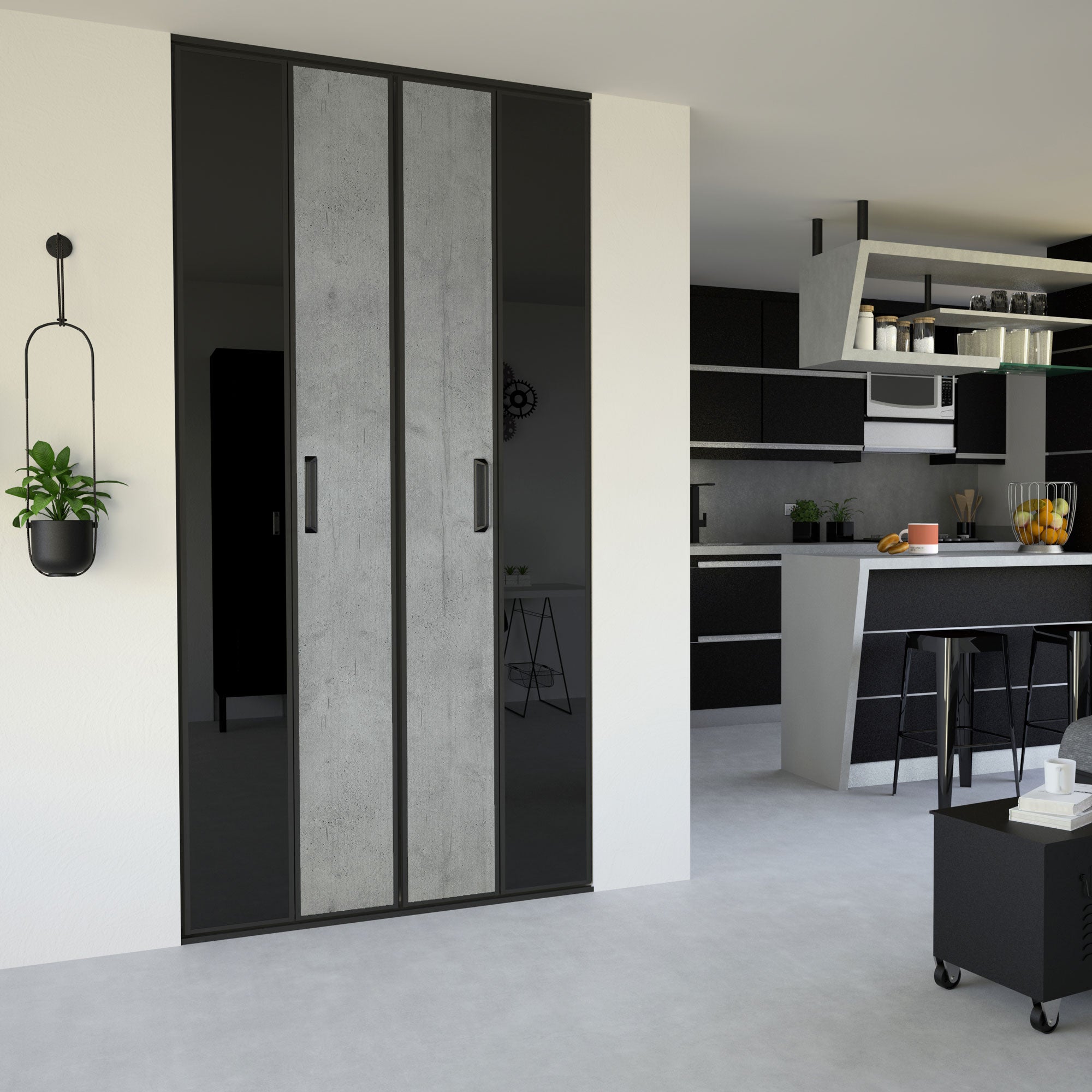 Le verre laqué noir est parfaitement assorti au décor effet béton wood sur cette façade de placard pliante à deux portes. La finition en aluminium noir mat complète parfaitement l’ensemble.