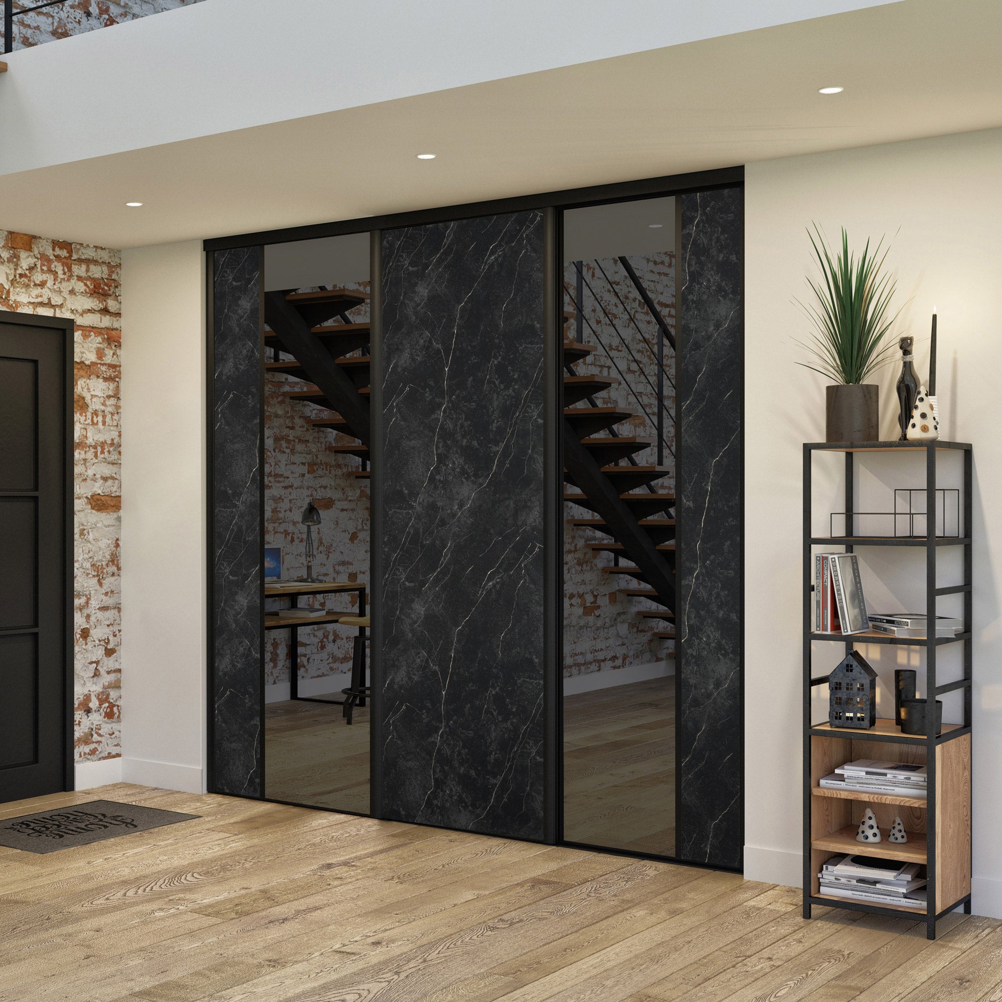 Osez l’effet Marbre noir sur vos portes de placard coulissantes Kazed, il leur apportera caractère et modernité. Le miroir Plomb donnera de la profondeur à votre pièce. Les finitions en aluminium Noir mat, quant à elles, seront le meilleur allié d’une déco industriel réussie.