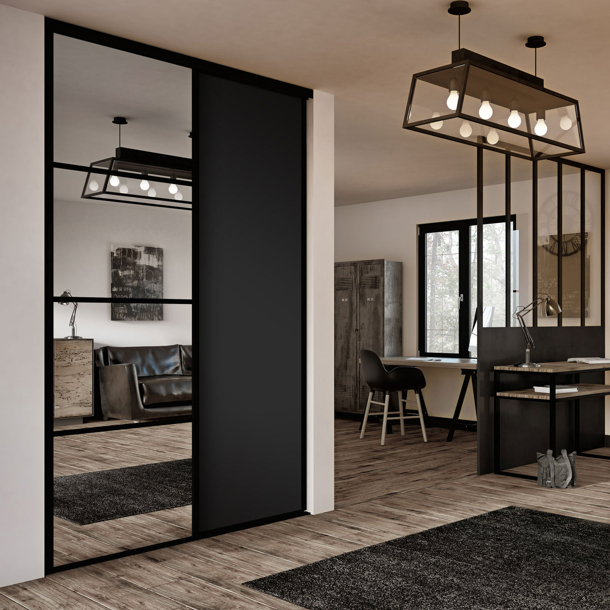 Le style industriel s'installe dans votre intérieur grâce à cette porte de placard. Le Noir intense est typique d'une ambiance factory, le miroir est particulièrement efficace pour agrandir de petits espaces ! Les finitions en aluminium noir mat offre un produit haut de gamme.