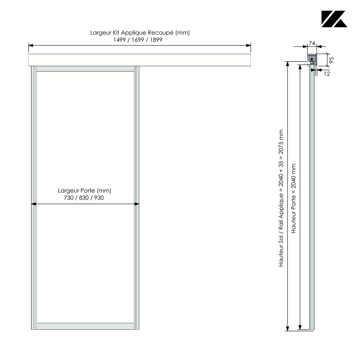 Pack complet : Porte coulissante avec amortisseur + rail en applique + cache rail recoupable.