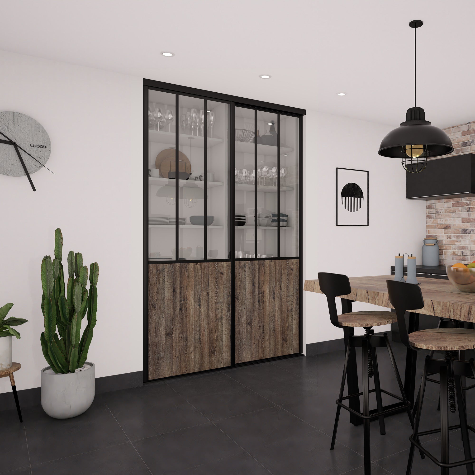 Style Industriel chic garanti avec cette façade de placard effet Authentique brun. Surmontée d’une vitre claire et de traverses verticales, elle deviendra l’atout charme de votre déco. Ses finitions soignées en aluminium Noir mat subliment l’ensemble.
