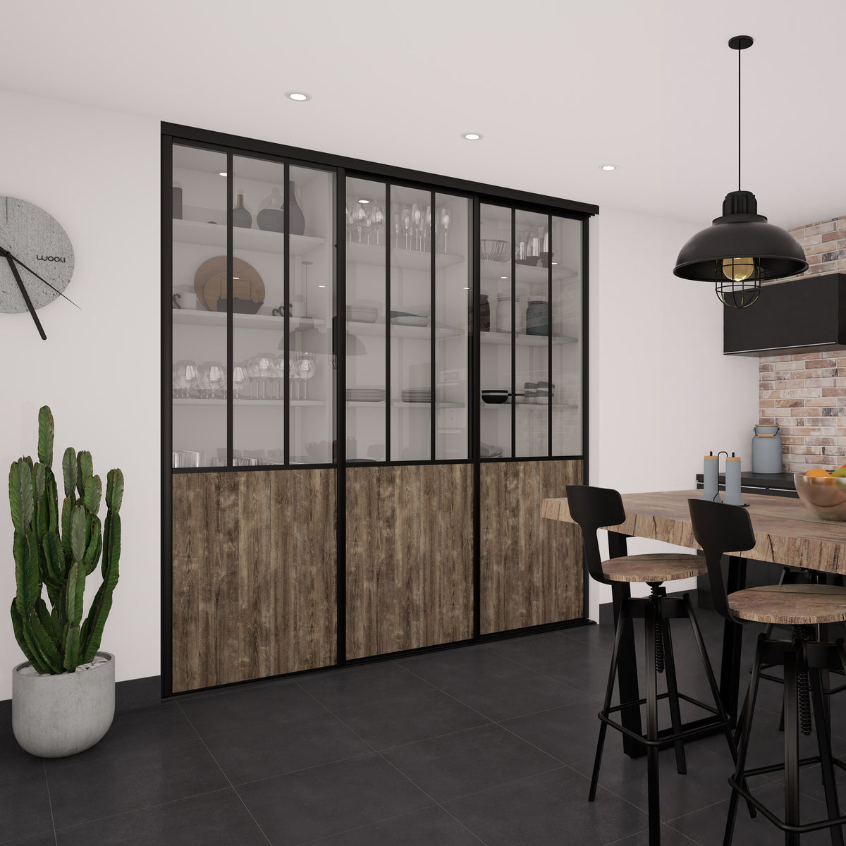 Double fonction pour ces portes Kazed ! Elles protègent votre vaisselle et autres objets de valeur de la poussière tout en les valorisant grâce à leur vitre claire ! Leur style branché effet Atelier, apporté par les traverses verticales et le décors Capanna Brun, n’est finalement qu’un plus qui sublimera votre déco.