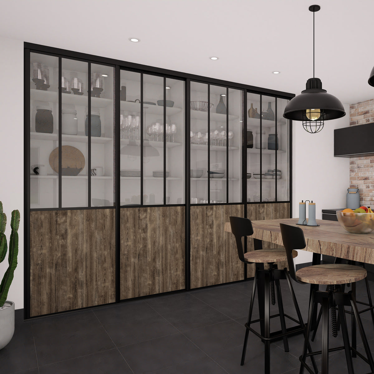 Double fonction pour ces portes Kazed ! Elles protègent votre vaisselle et autres objets de valeur de la poussière tout en les valorisant grâce à leur vitre claire ! Leur style branché effet Atelier, apporté par les traverses verticales et le décors Capanna Brun, n’est finalement qu’un plus qui sublimera votre déco.