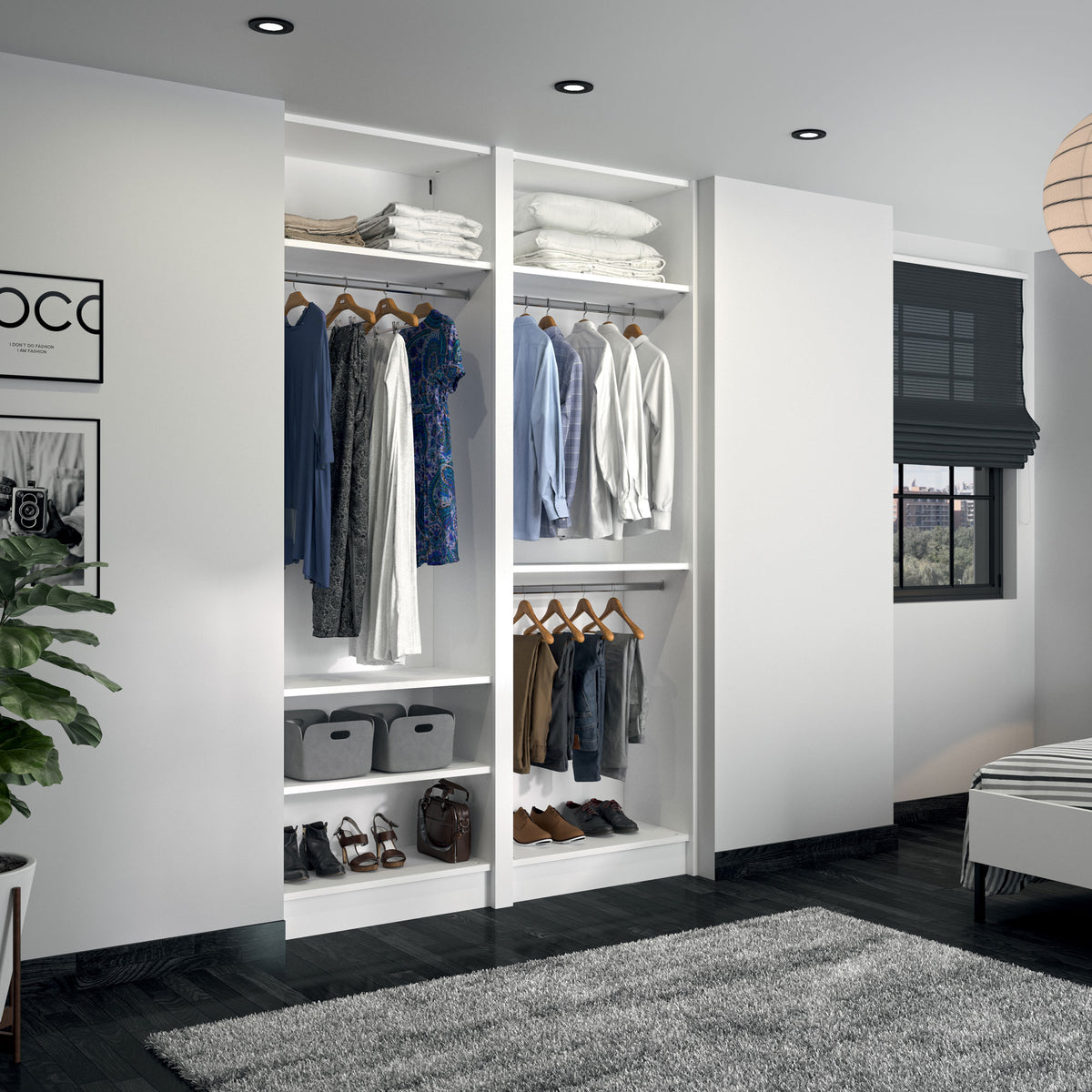 Ce dressing Blanc Mat de 2 espaces est composé de trois tringles (1 penderie longue pour les robes et manteaux et 2 penderies courtes pour les vêtements de type chemises, vestes) et de 5 étagères de rangement (idéales pour les vêtements pliés, comme les t-shirts et les pulls).