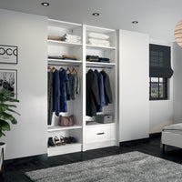 Ce dressing Blanc Mat de 2 espaces est composé de deux tringles (2 penderies longues pour les robes et manteaux), de 6 étagères de rangement (idéales pour les vêtements pliés, comme les t-shirts et les pulls), et d'un tiroir double (pour recevoir des objets volumineux comme les sous vêtements).