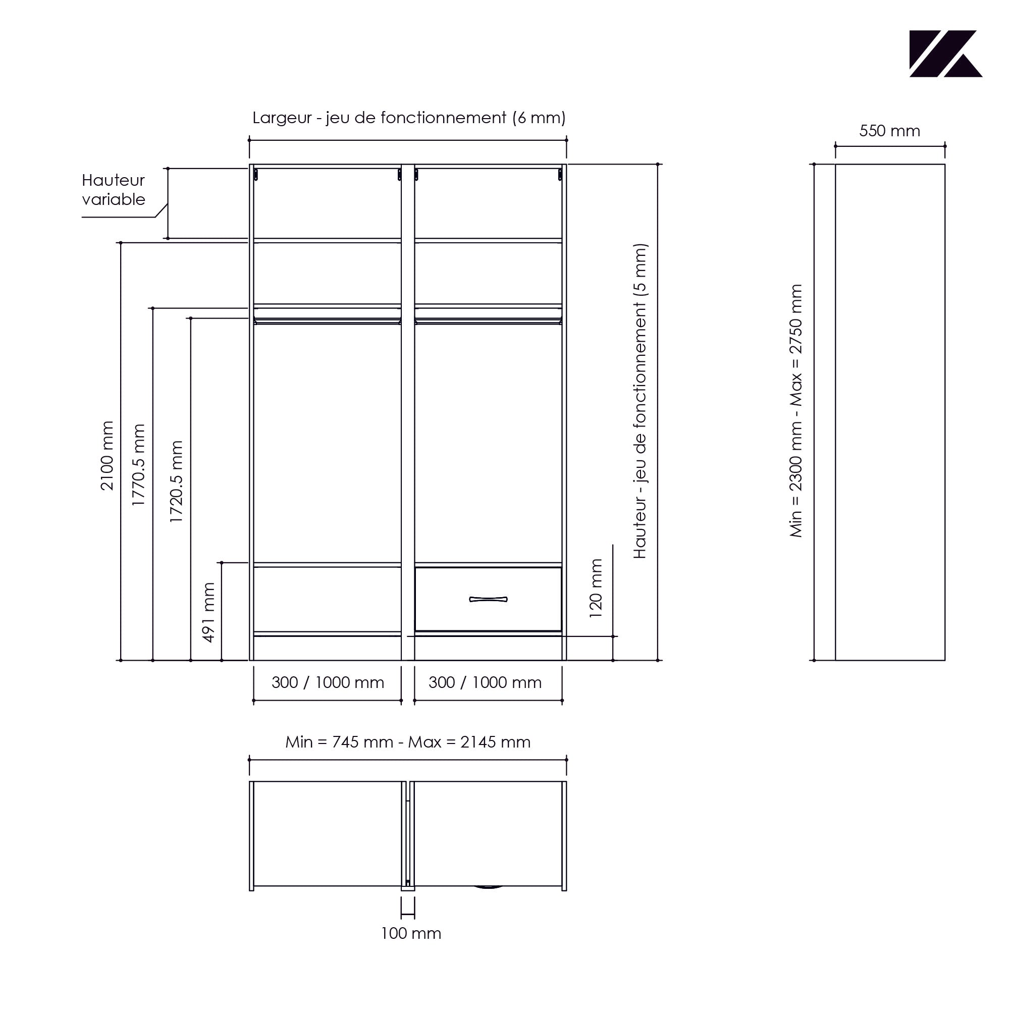 Les points forts : Fabriqué à vos dimensions. Epaisseur de la structure 22 mm, fond de 8 mm monté en rainure pour une rigidité parfaite. Des pieds de réglages permettent le bon ajustement de votre dressing. Konsilio est parfaitement adapté à une installation avec ou sans portes de placard Kazed.