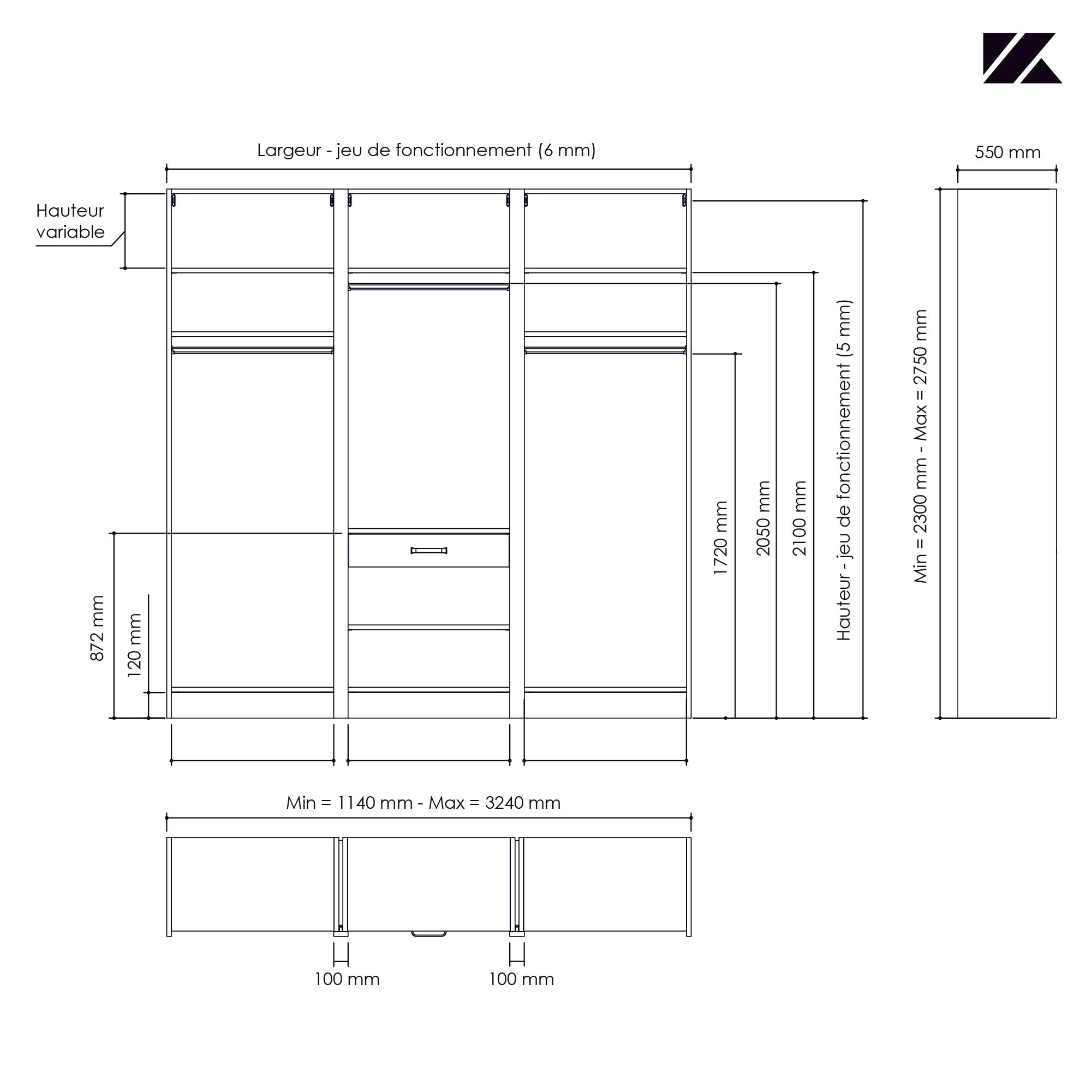 Les points forts : Fabriqué à vos dimensions. Epaisseur de la structure 22 mm, fond de 8 mm monté en rainure pour une rigidité parfaite. Des pieds de réglages permettent le bon ajustement de votre dressing. Konsilio est parfaitement adapté à une installation avec ou sans portes de placard Kazed.