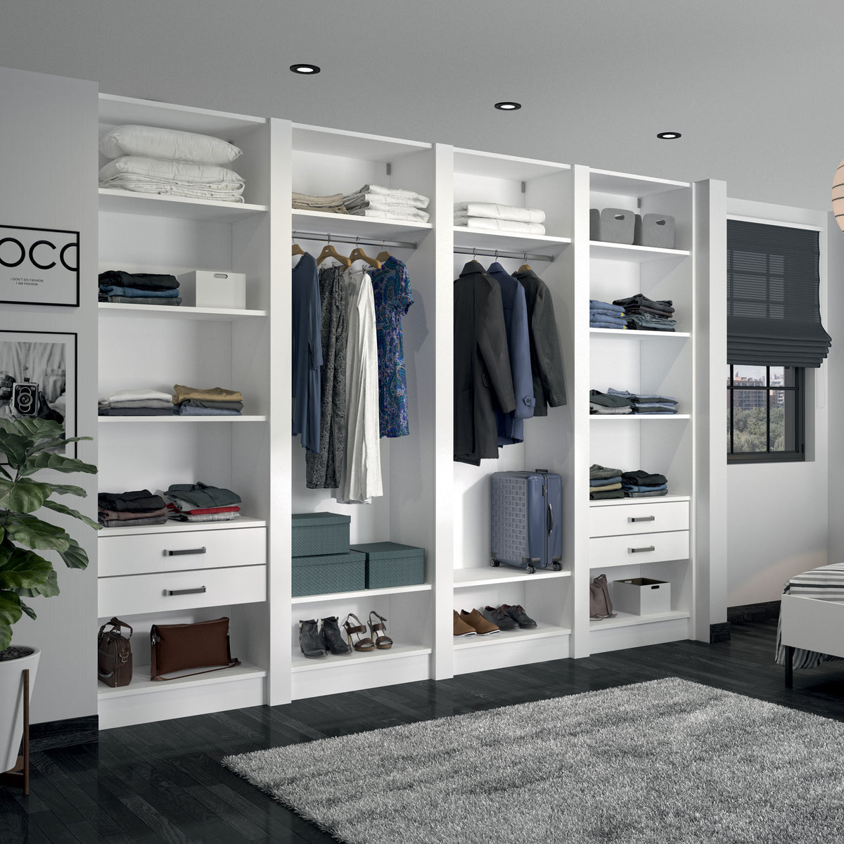 Ce dressing Blanc Mat de 4 espaces est composé de deux tringles (2 penderies longues pour les robes et manteaux), de 12 étagères de rangement (idéales pour les vêtements pliés, comme les t-shirts et les pulls), et de quatre tiroirs simples (pour accueillir les accessoires et les ceintures).
