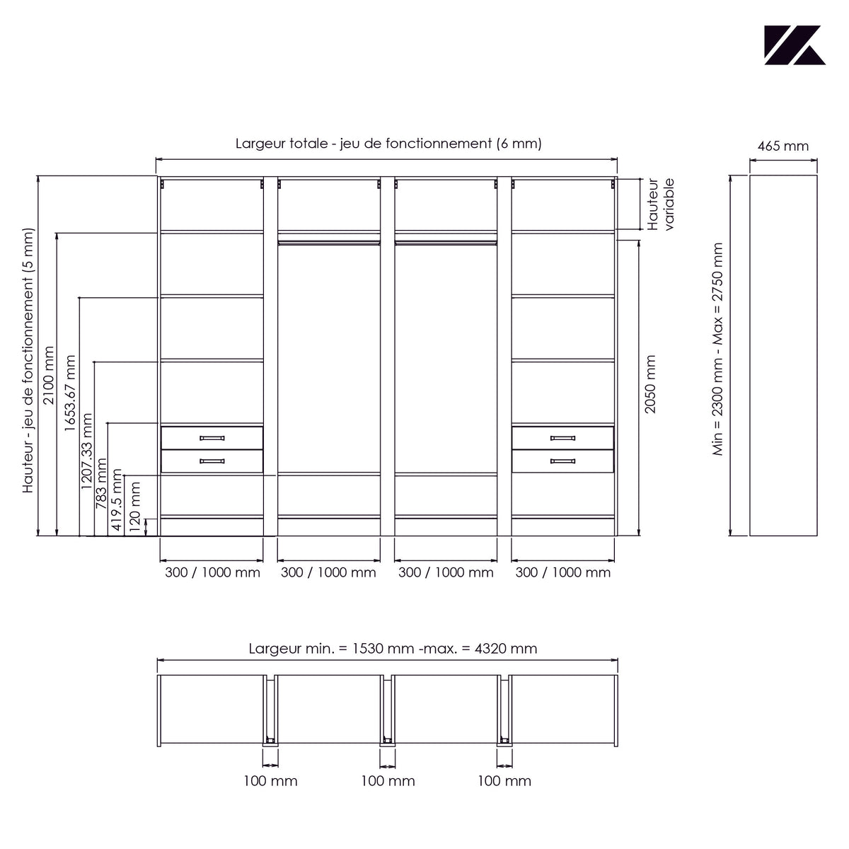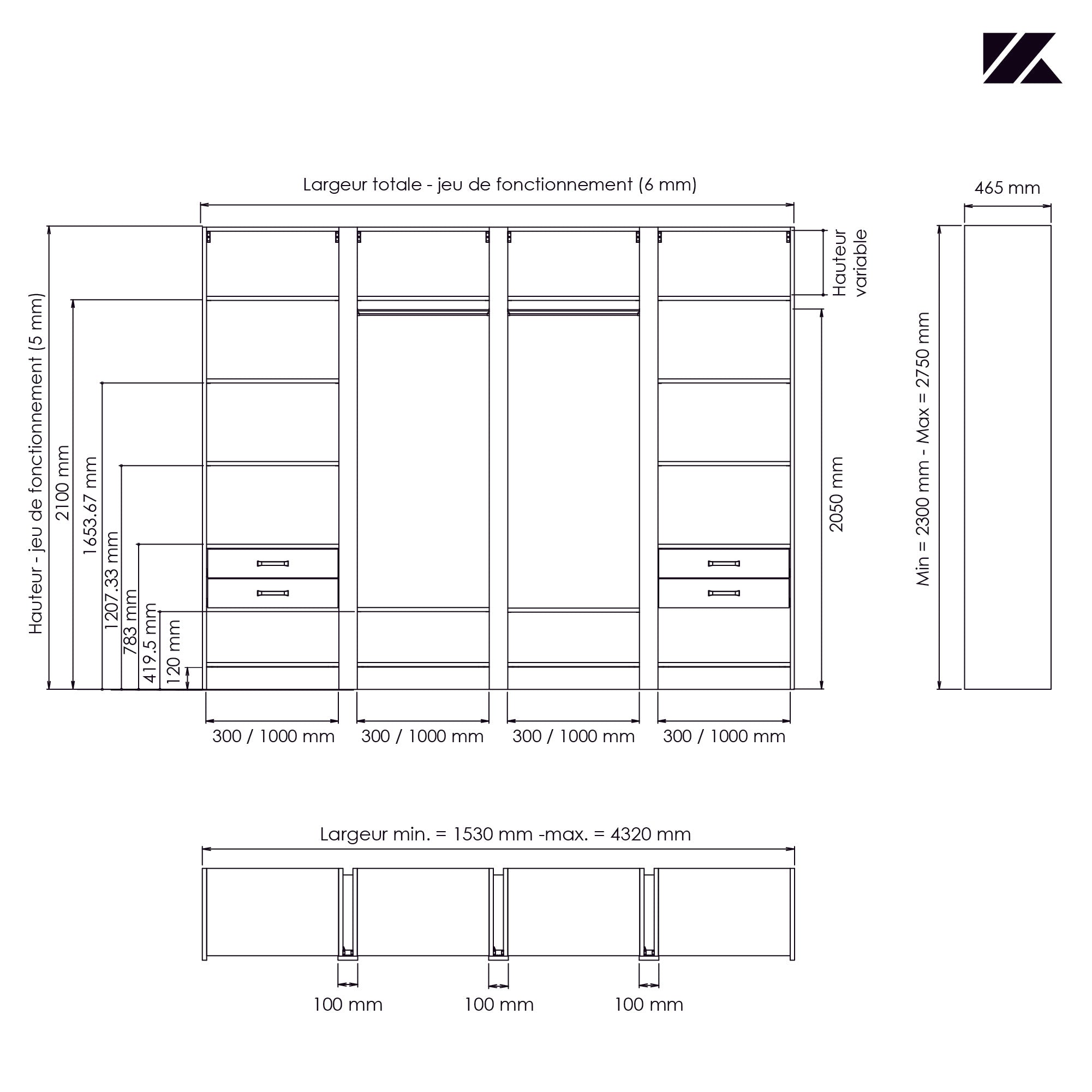 Parfaitement compatibles avec nos façades de placard coulissantes 4 vantaux, les nouvelles compositions Konsilio 4 espaces apportent de nombreuses solutions de rangement. Elles sont idéales pour les dressings grandes dimensions !