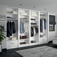Ce dressing Blanc Mat de 4 espaces est composé de quatre tringles (4 penderies courtes pour les vêtements de type chemises, vestes), de 11 étagères de rangement (idéales pour les vêtements pliés, comme les t-shirts et les pulls), et de deux tiroirs doubles (pour recevoir des objets volumineux comme les sous vêtements).