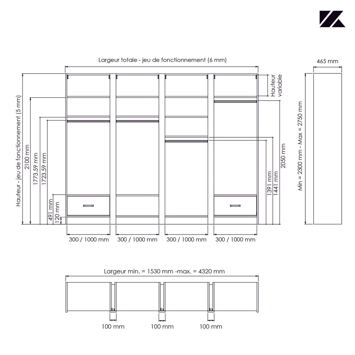 Parfaitement compatibles avec nos façades de placard coulissantes 4 vantaux, les nouvelles compositions Konsilio 4 espaces apportent de nombreuses solutions de rangement. Elles sont idéales pour les dressings grandes dimensions !