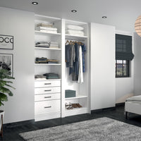 Ce dressing Blanc Mat de 2 espaces est composé d'une tringle (1 penderie longue pour les robes et manteaux), de 6 étagères de rangement (idéales pour les vêtements pliés, comme les t-shirts et les pulls), et de trois tiroirs simples (pour accueillir les accessoires et les ceintures).