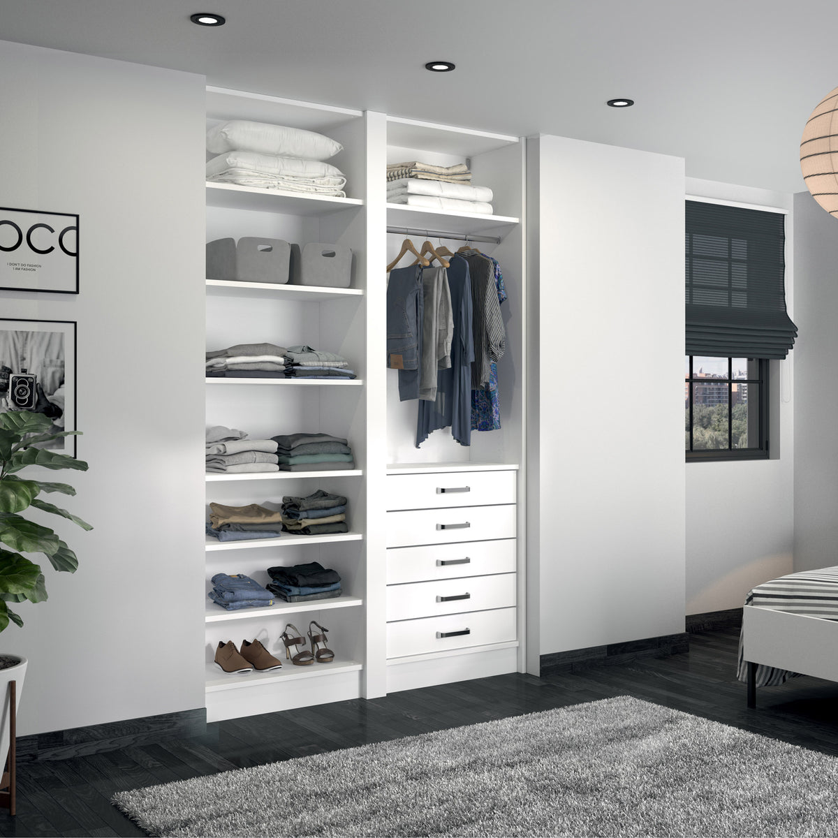Ce dressing Blanc Mat de 2 espaces est composé d'une tringle (1 penderie courte pour les vêtements de type chemises, vestes), de 8 étagères de rangement (idéales pour les vêtements pliés, comme les t-shirts et les pulls), et de cinq tiroirs simples (pour accueillir les accessoires et les ceintures).