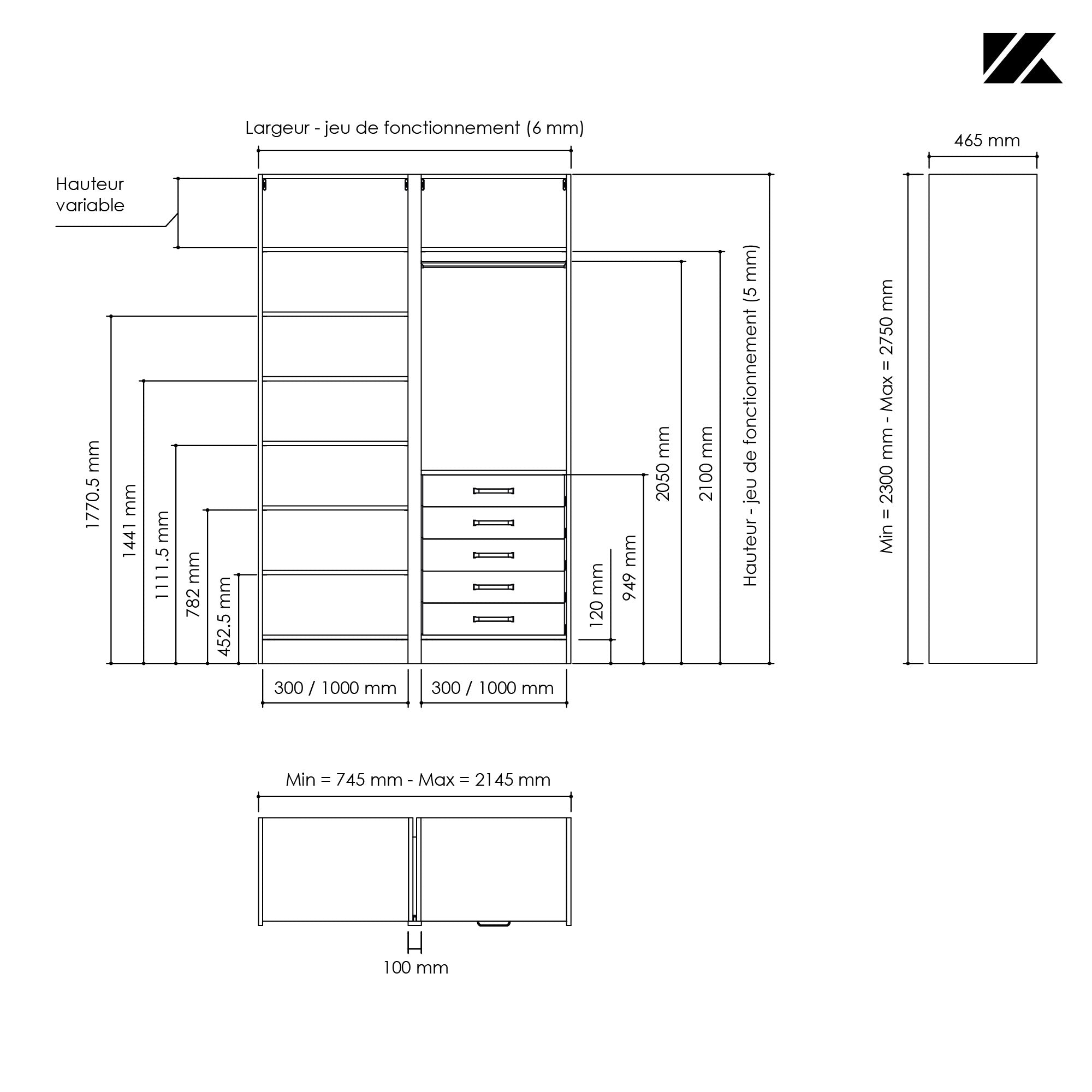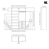 Les points forts : Fabriqué à vos dimensions. Epaisseur de la structure 22 mm, fond de 8 mm monté en rainure pour une rigidité parfaite. Des pieds de réglages permettent le bon ajustement de votre dressing. Konsilio est parfaitement adapté à une installation avec ou sans portes de placard Kazed.