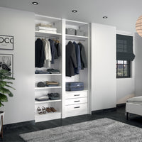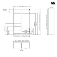 Ce dressing Blanc Mat de 2 espaces est composé de deux tringles (1 penderie longue pour les robes et manteaux et 1 penderie courte pour les vêtements de type chemises, vestes), de 6 étagères de rangement (idéales pour les vêtements pliés, comme les t-shirts et les pulls), et de trois tiroirs simples (pour accueillir les accessoires et les ceintures).