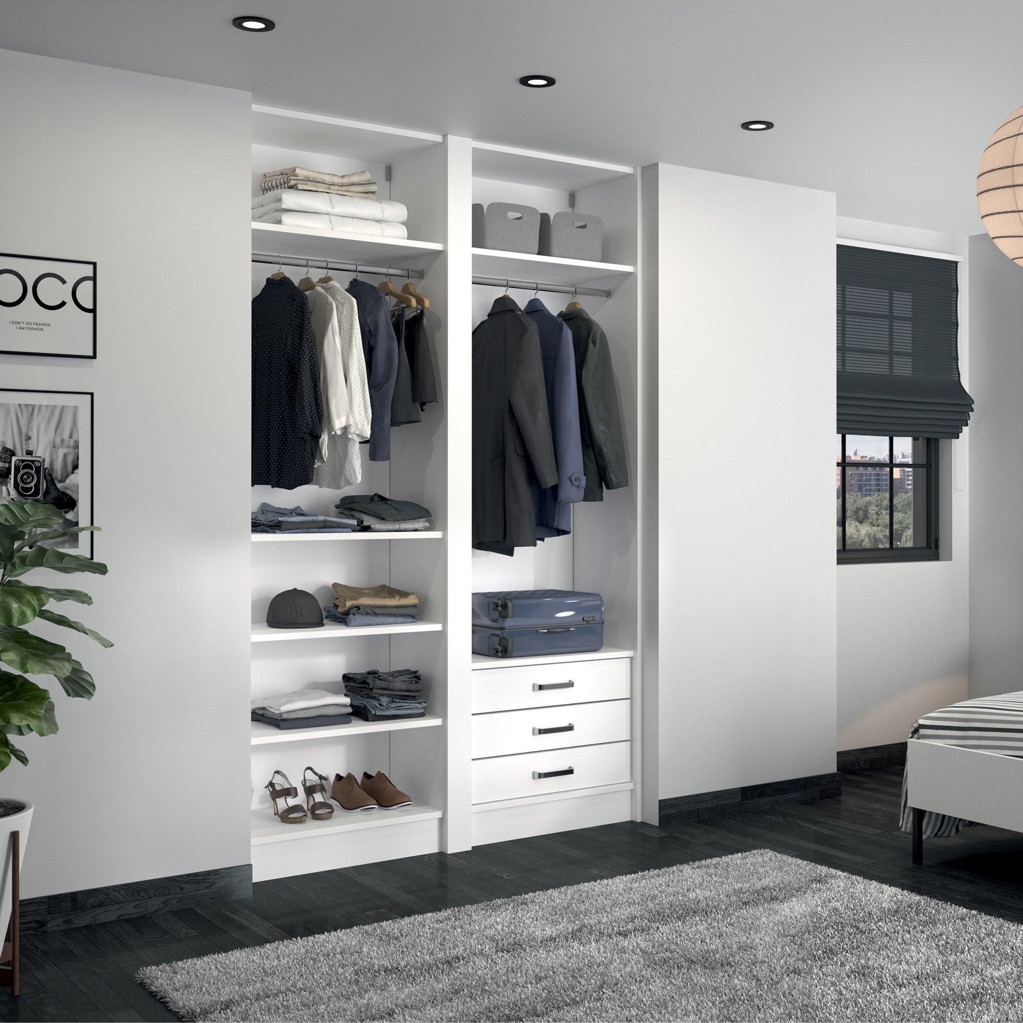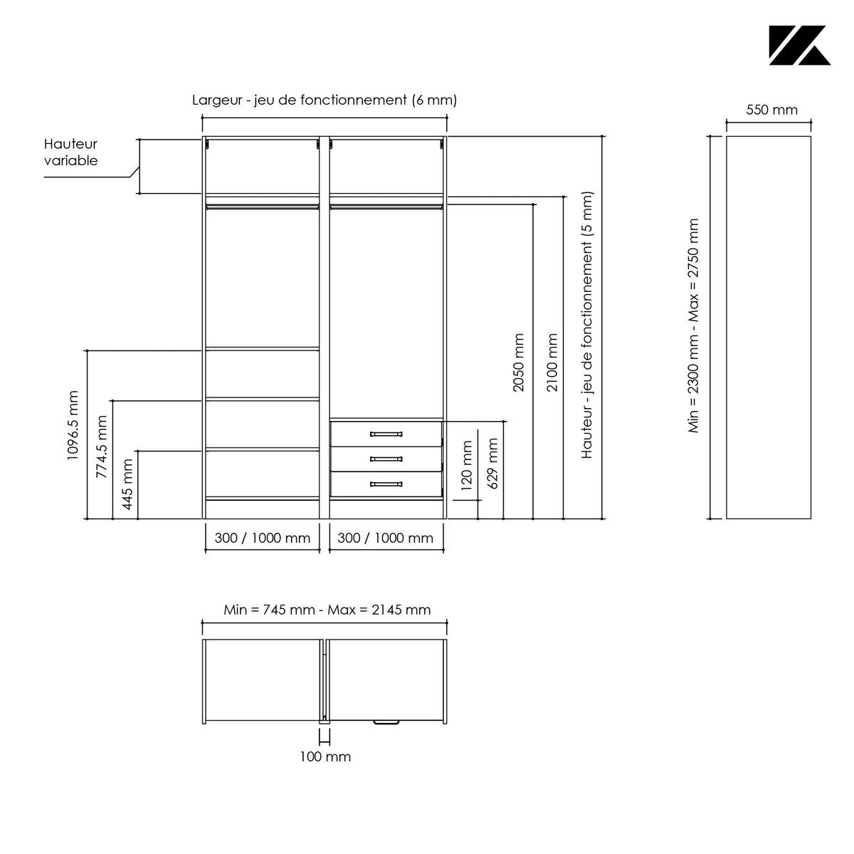 Les points forts : Fabriqué à vos dimensions. Epaisseur de la structure 22 mm, fond de 8 mm monté en rainure pour une rigidité parfaite. Des pieds de réglages permettent le bon ajustement de votre dressing. Konsilio est parfaitement adapté à une installation avec ou sans portes de placard Kazed.