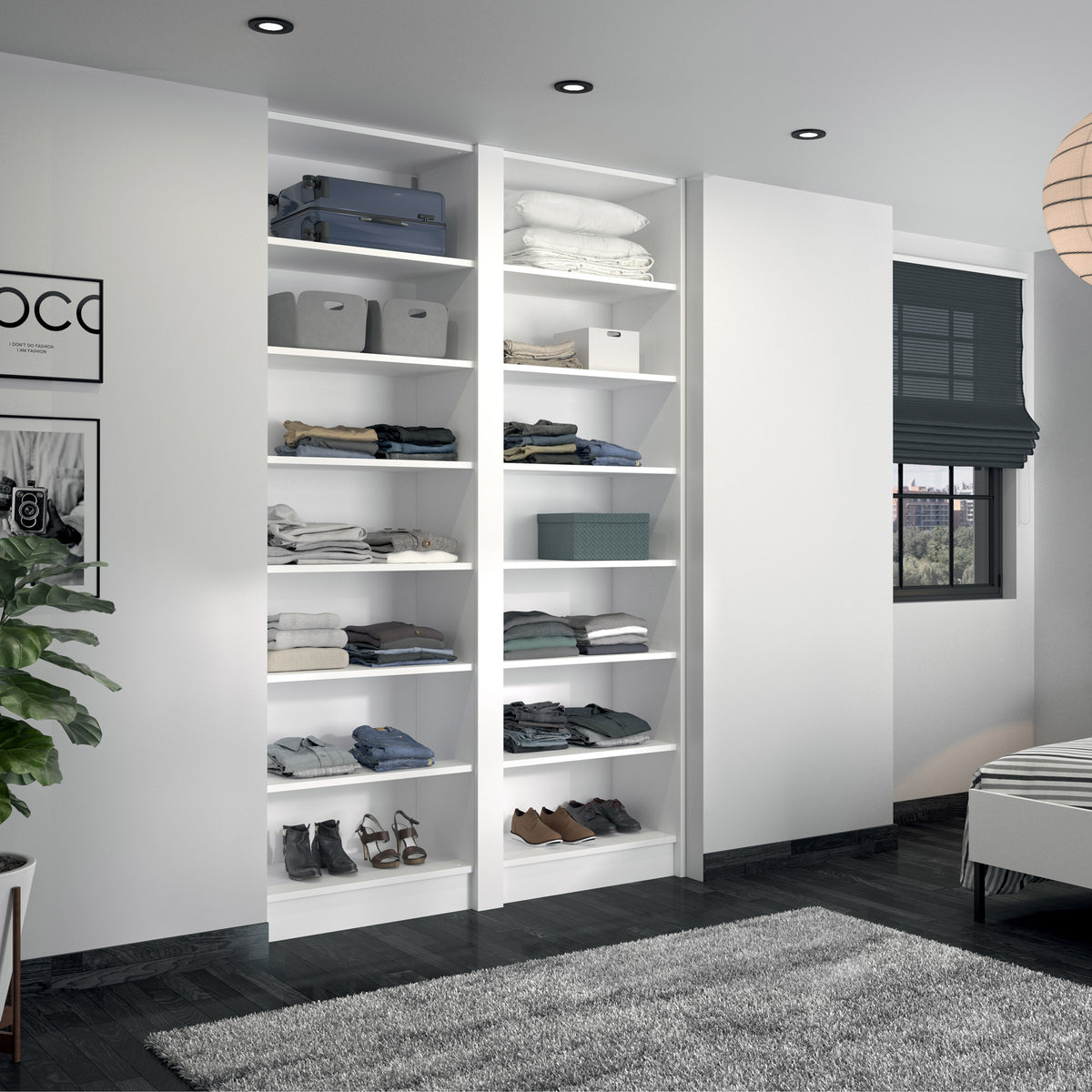 Ce dressing Blanc Mat de 2 espaces est composé () et de 12 étagères de rangement (idéales pour les vêtements pliés, comme les t-shirts et les pulls).