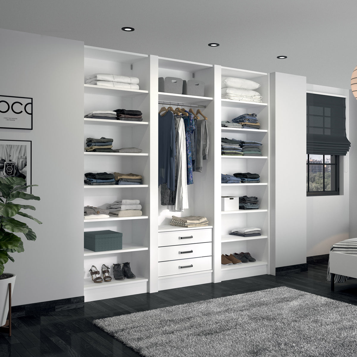 Ce dressing Blanc Mat de 3 espaces est composé d'une tringle (1 penderie longue pour les robes et manteaux), de 14 étagères de rangement (idéales pour les vêtements pliés, comme les t-shirts et les pulls), et de cinq tiroirs simples (pour accueillir les accessoires et les ceintures).