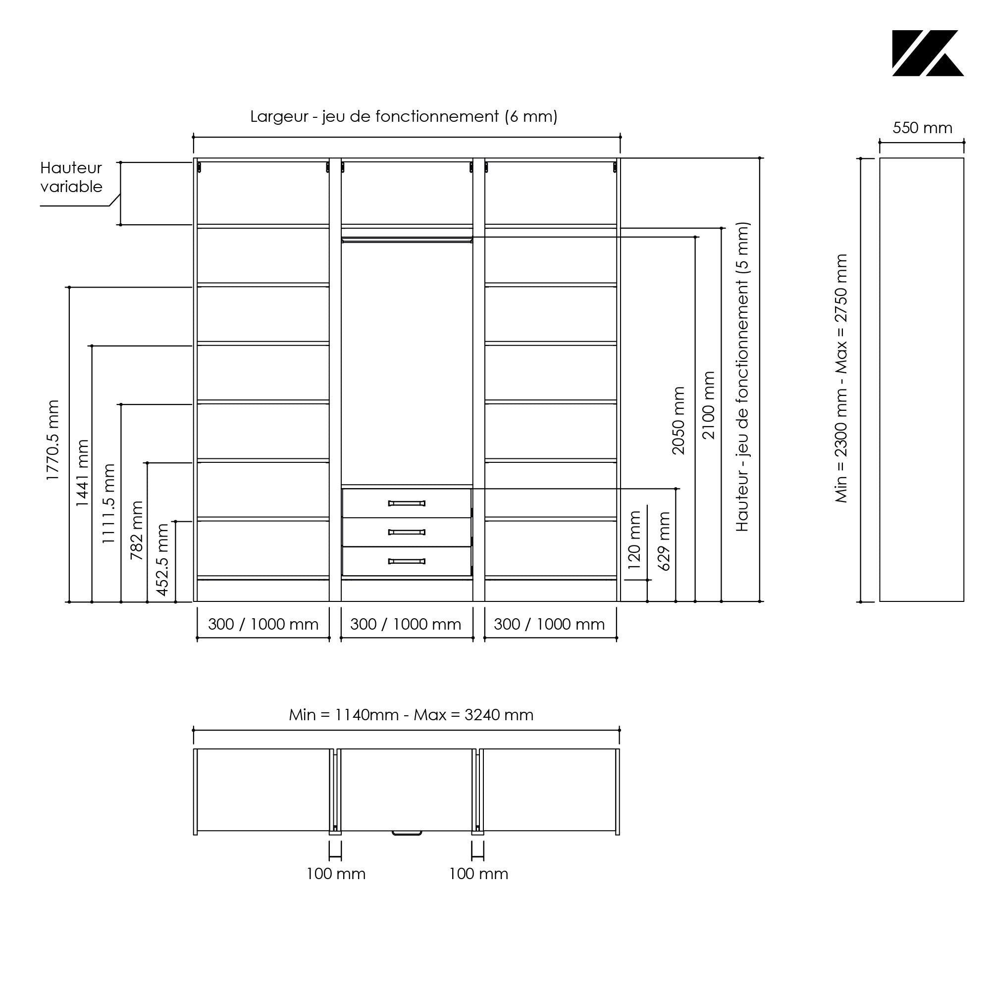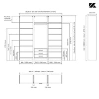 Les points forts : Fabriqué à vos dimensions. Epaisseur de la structure 22 mm, fond de 8 mm monté en rainure pour une rigidité parfaite. Des pieds de réglages permettent le bon ajustement de votre dressing. Konsilio est parfaitement adapté à une installation avec ou sans portes de placard Kazed.