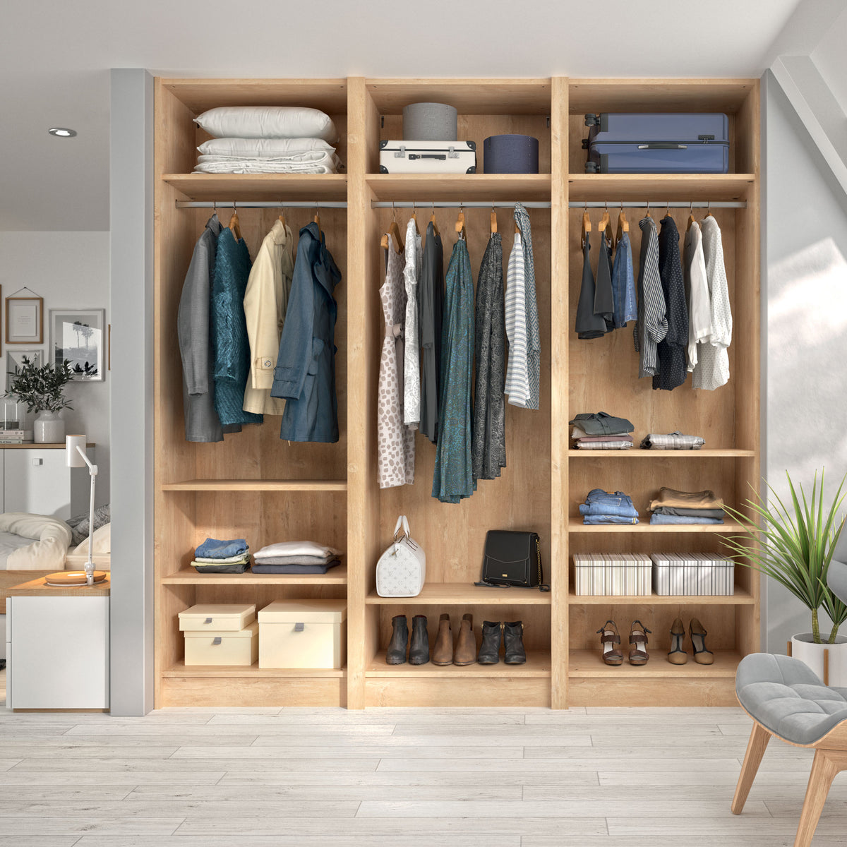 Ce dressing Chêne Blond de 3 espaces est composé de trois tringles (1 penderie longue pour les robes et manteaux et 2 penderies courtes pour les vêtements de type chemises, vestes) et de 9 étagères de rangement (idéales pour les vêtements pliés, comme les t-shirts et les pulls).
