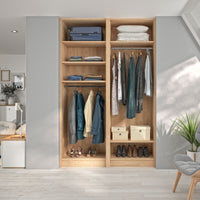 Ce dressing Chêne Blond de 2 espaces est composé de deux tringles (1 penderie longue pour les robes et manteaux et 1 penderie courte pour les vêtements de type chemises, vestes) et de 5 étagères de rangement (idéales pour les vêtements pliés, comme les t-shirts et les pulls).