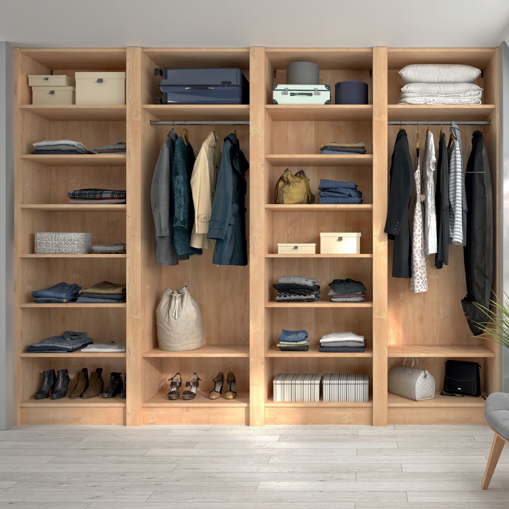 Ce dressing Chêne Blond de 4 espaces est composé de deux tringles (2 penderies longues pour les robes et manteaux) et de 16 étagères de rangement (idéales pour les vêtements pliés, comme les t-shirts et les pulls).