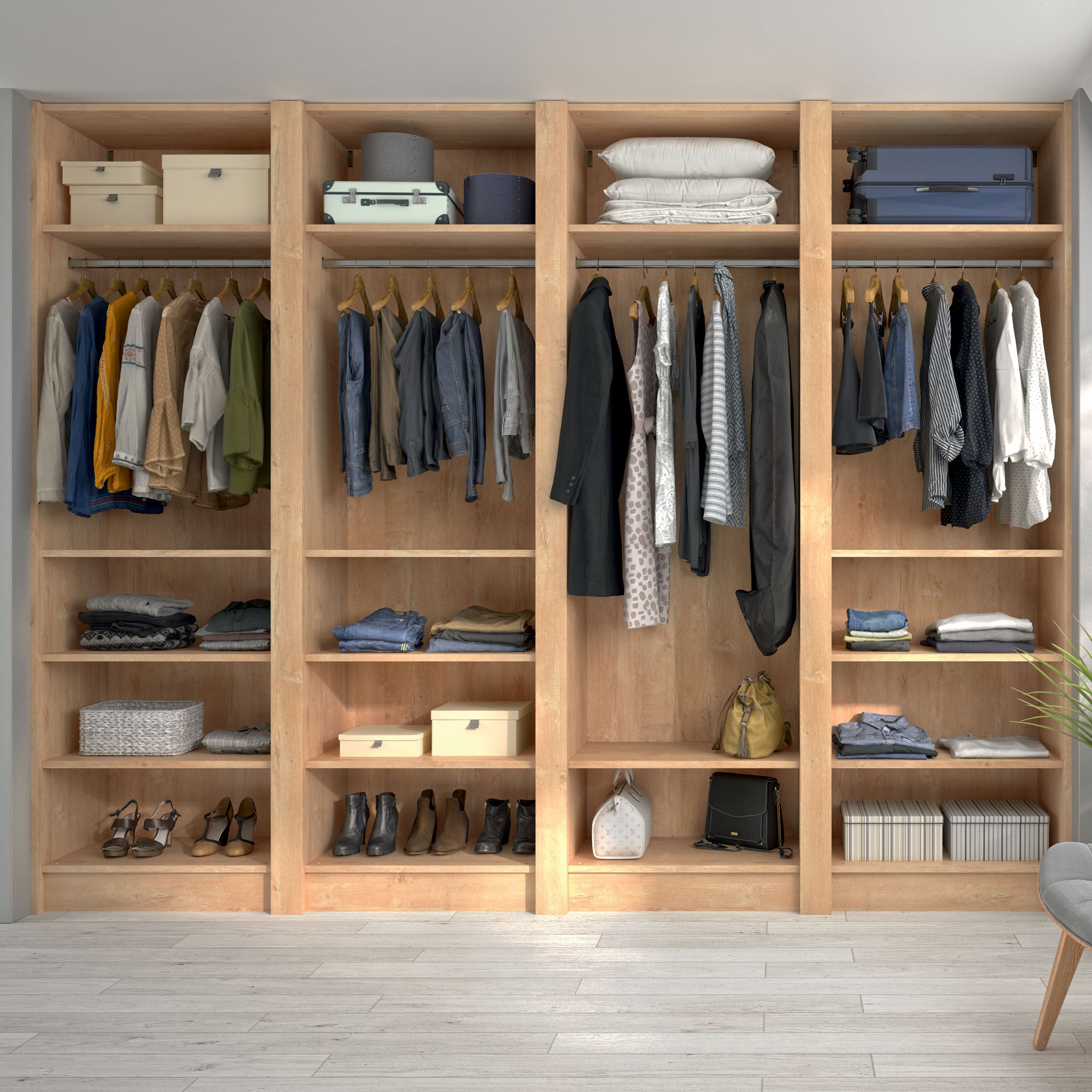 Ce dressing Chêne Blond de 4 espaces est composé de quatre tringles (1 penderie longue pour les robes et manteaux et 3 penderies courtes pour les vêtements de type chemises, vestes) et de 14 étagères de rangement (idéales pour les vêtements pliés, comme les t-shirts et les pulls).