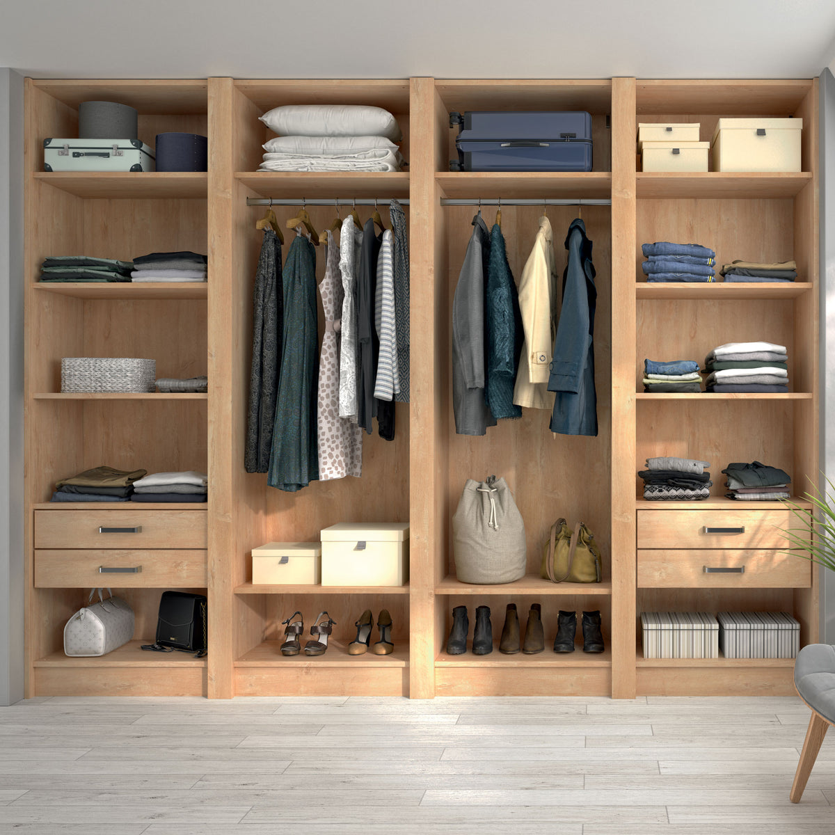 Ce dressing Chêne Blond de 4 espaces est composé de deux tringles (2 penderies longues pour les robes et manteaux), de 12 étagères de rangement (idéales pour les vêtements pliés, comme les t-shirts et les pulls), et de quatre tiroirs simples (pour accueillir les accessoires et les ceintures).