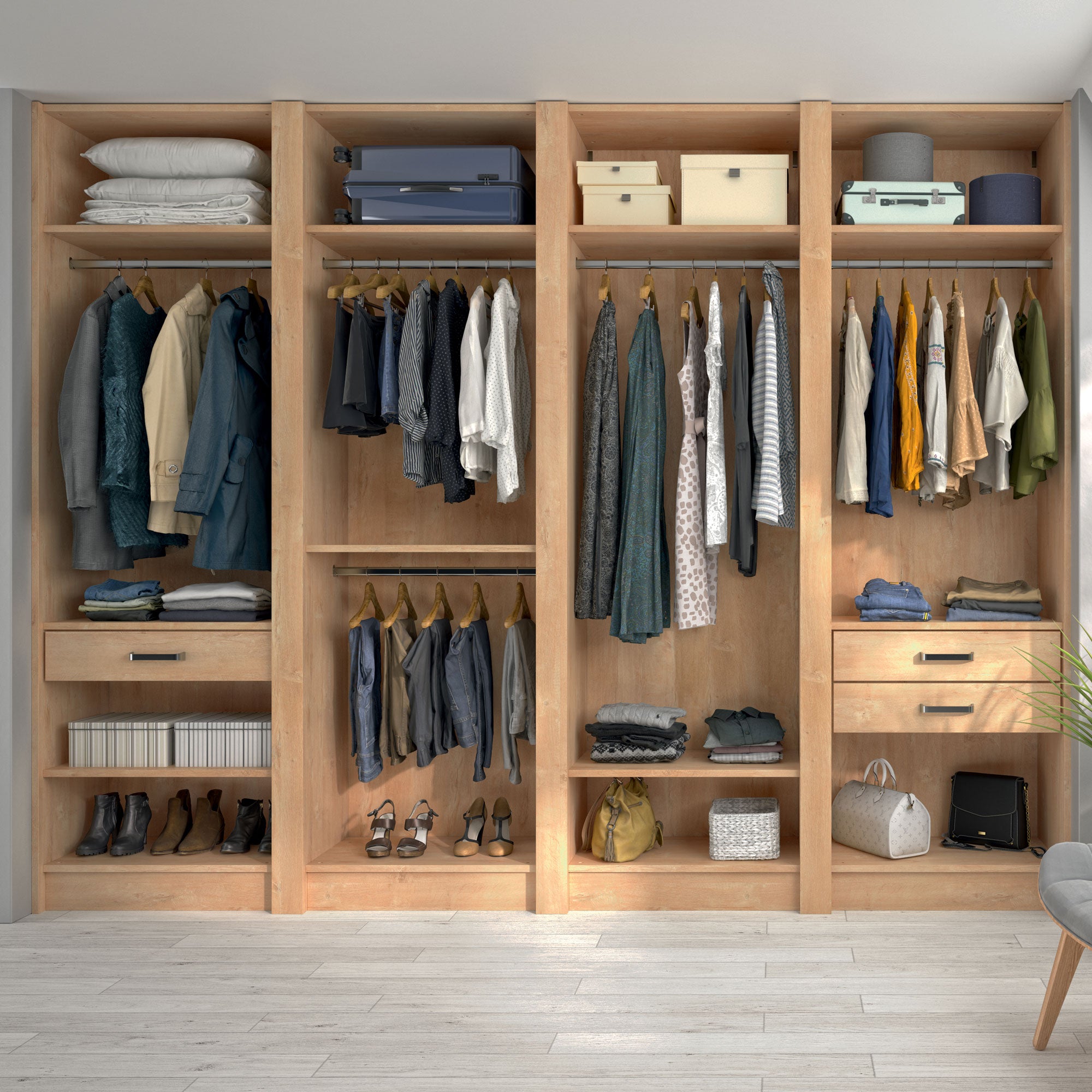 Ce dressing Chêne Blond de 4 espaces est composé de cinq tringles (2 penderies longues pour les robes et manteaux et 4 penderies courtes pour les vêtements de type chemises, vestes), de 9 étagères de rangement (idéales pour les vêtements pliés, comme les t-shirts et les pulls), et de trois tiroirs simples (pour accueillir les accessoires et les ceintures).